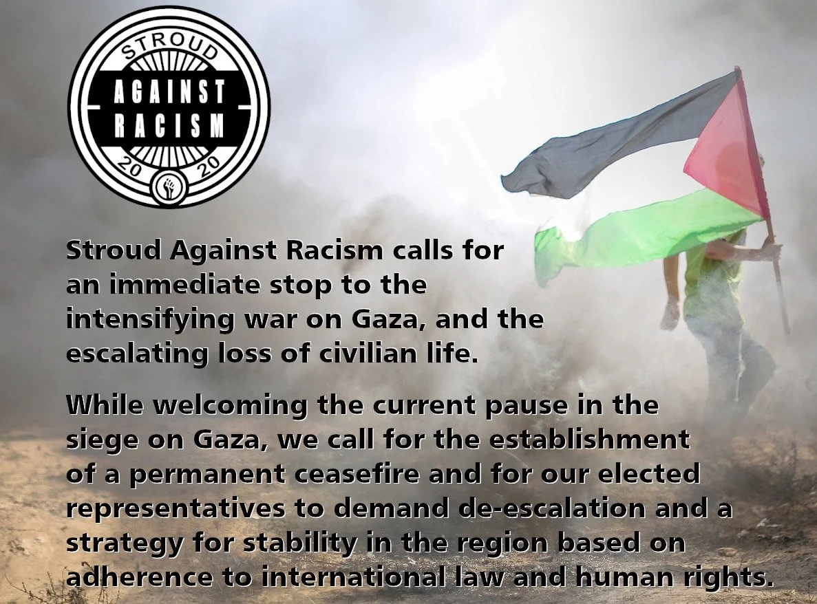 Stroud Against Racism calls for an immediate stop to the intensifying war on Gaza and the escalating loss of civilian life.